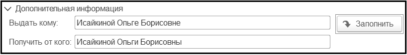 В разделе Дополнительная информация можно ввести ФИО сотрудника в дательном и родительном падежах для автоматического заполнения реквизитов Выдать кому, Получено от кого в первичных документах. Информация заполняется автоматически по кнопке Заполнить.