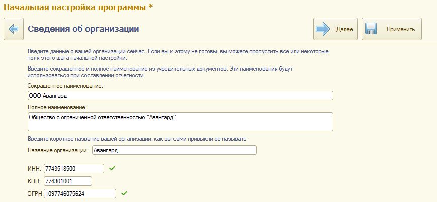 Заполним сведения об организации, по которой планируется вести учет в базе: