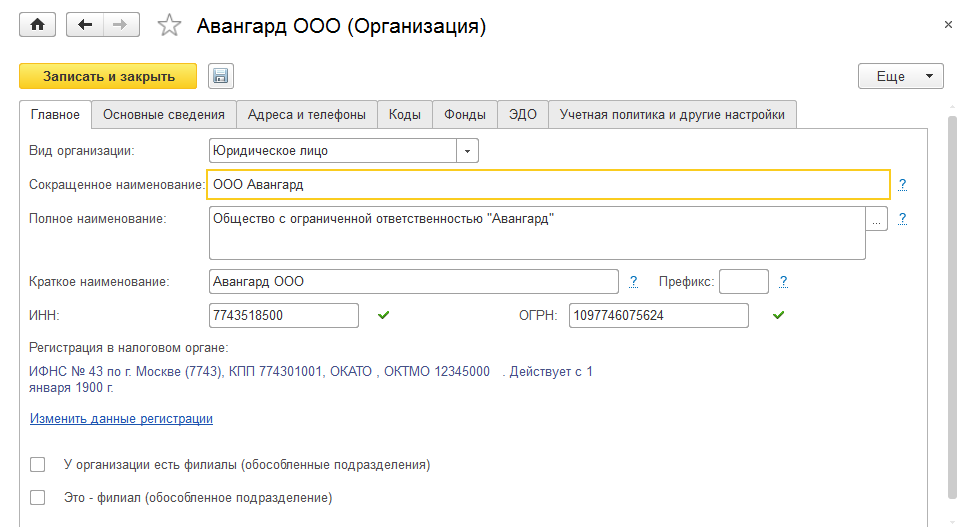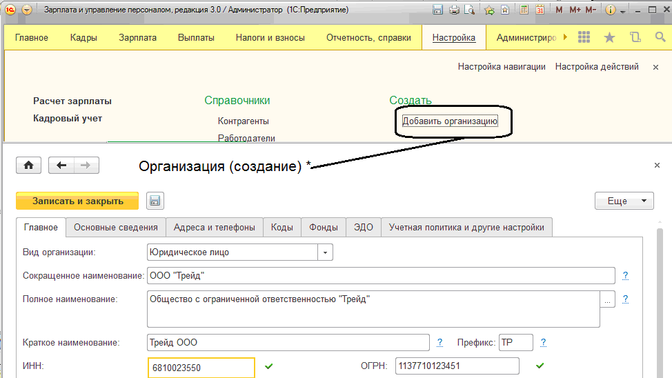 Укажем наименование организации ООО "Трейд", основные коды (ИНН 6810023550; ОГРН 1137710123451), префикс (ТР)- как на рисунке ниже.
