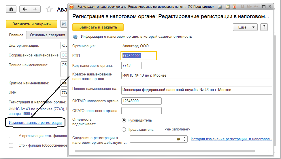Сведения о регистрации в ИФНС хранятся в отдельном справочнике. Из формы организации по ссылке "Изменить данные регистрации" можно перейти к просмотру и вводу данных о регистрации организации в налоговом органе: краткое и полное наименование ИФНС, КПП, ОКТМО. Кроме того, здесь указывается период, с которого действуют данные о регистрации (в случае перерегистрации в ИФНС необходимо будет указать новые реквизиты на дату перерегистрации).