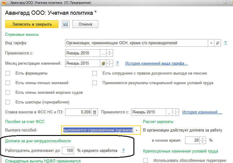 4. Если в организации установлено, что используется доплата за дни болезни за счет собственных средств организации (см. настройки программы / расчет зарплаты), то в настройках учетной политики можно указать процент такой доплаты. См. также раздел по больничному листу.