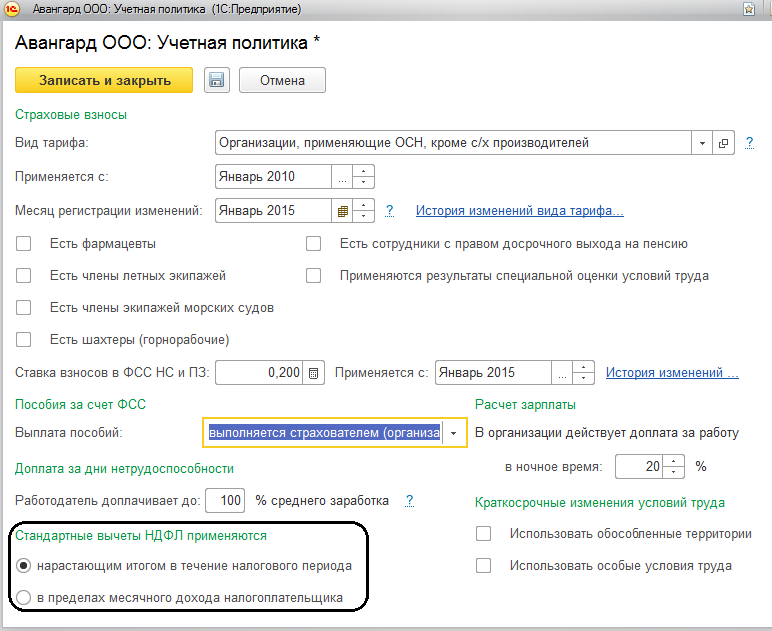 6. Далее настраивается порядок применения стандартных вычетов по НДФЛ в течение налогового периода (года) для сотрудников выбранной организации: нарастающим итогом или в пределах месячного дохода.