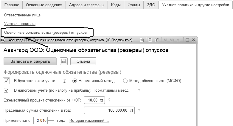Настроим для ООО "Авангард" применение оценочных обязательств и резервов в учете нормативным методом с 2016г.