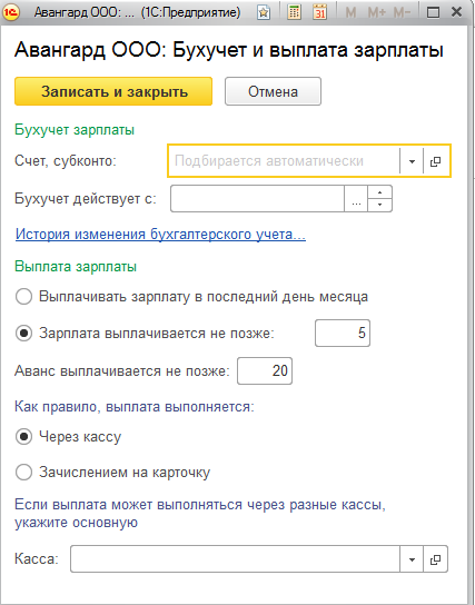 В разделе "Выплата" указываются сроки выплаты заработной платы (они потребуются для автоматической регистрации даты удержания НДФЛ с доходов сотрудников), а также порядок выдачи денег сотрудникам: через кассу (в этом случае заполняется основная касса) либо по зарплатному проекту (в этом случае указывается ссылка на основной зарплатный проект).