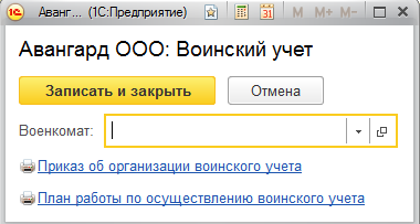 По ссылке "Воинский учет" (ссылка доступна, если в настройке кадрового учета программы включена соответствующая опция) можно вывести на печать приказы об организации ведения воинского учета.