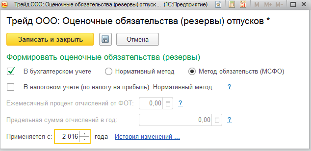 И) Заполним настройки оценочных обязательств. В данной организации используется метод обязательств, резервы в налоговом учете не формируются.