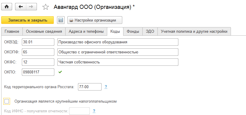 Е) Укажем на закладке "Коды" информацию для отчетности (наименования сокращены в рамках учебного курса)