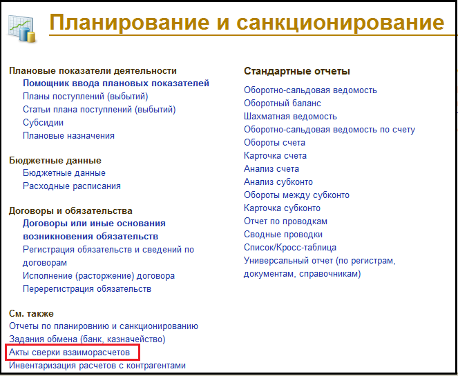 Перейти к документу Акт сверки взаиморасчетов можно через панель навигации раздела Планирование и санкционирование.