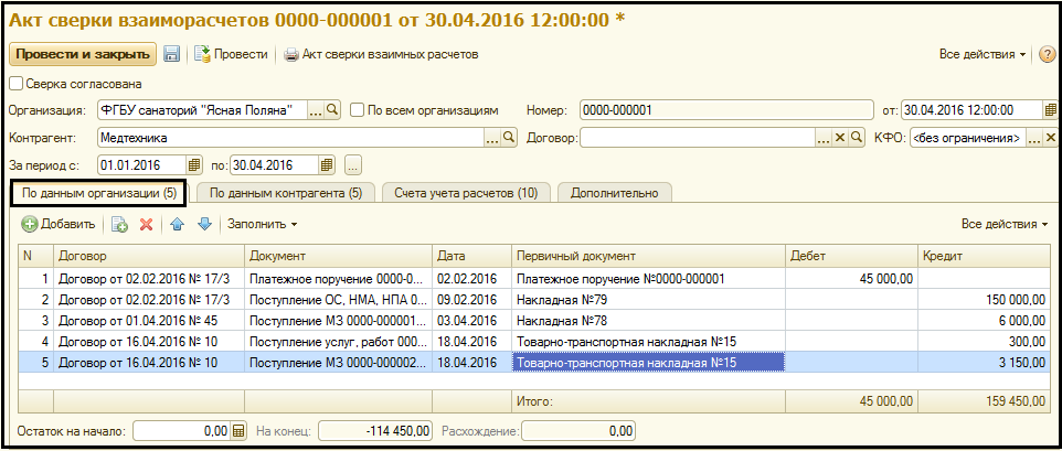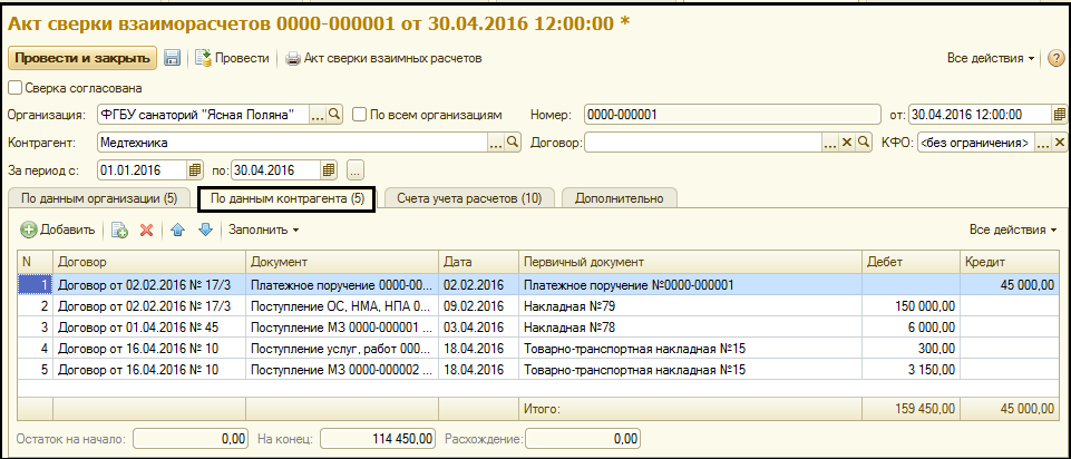 В нижней части закладки в блоке Итого выводятся суммы остатков на начало и конец периода; также выдается информация о расхождении в суммах с данными контрагента в целом по документу.