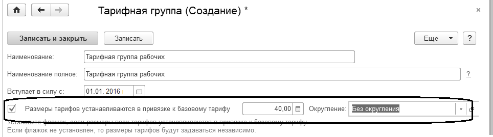 При создании тарифной группы указывается наименование краткое и полное. Далее определяется порядок расчета: будут указаны суммы вручную (тогда для каждого разряда указывается сумма) либо будет производиться расчет как коэффициент от базового тарифа (тогда для каждого разряда указывается тарифный коэффициент). Во втором случае следует отметить соответствующий флаг.