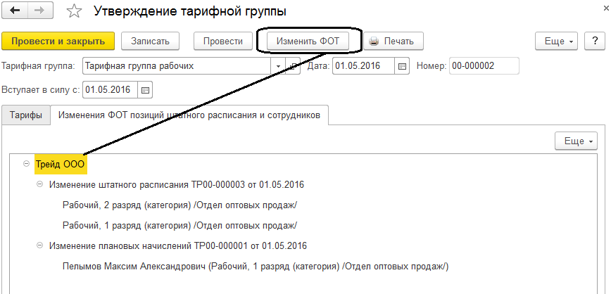 На закладке "Изменения ФОТ позиций штатного расписания и сотрудников" указываются изменения по позициям и изменения по сотрудникам.