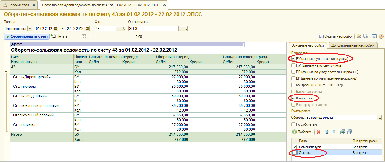 Убедитесь, что дебетовый оборот за период составляет 217 350.00 руб.; а общее количество готовой продукции, переданной из производства – 272 единицы.
