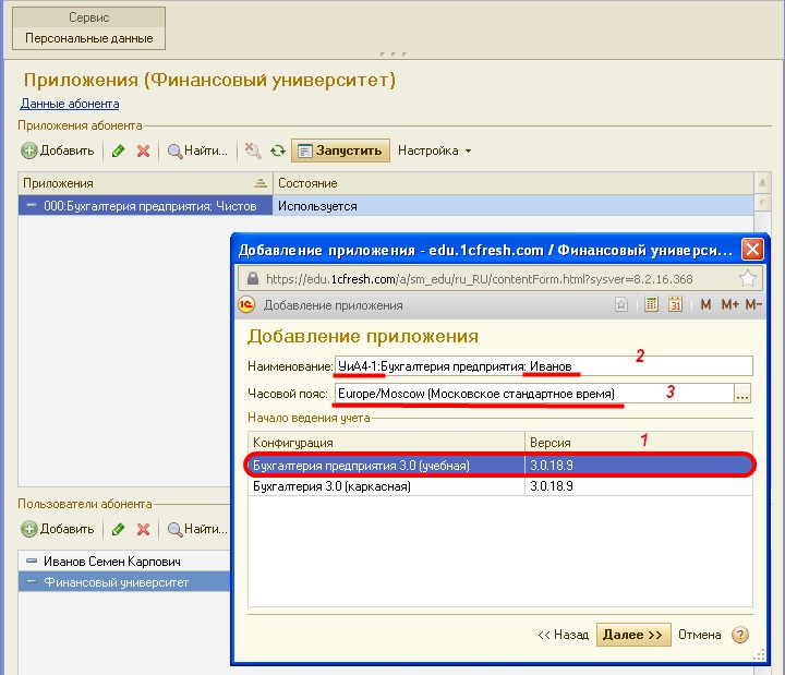 В качестве примера возьмем существующего пользователя Иванова Семена Карповича и создадим для него индивидуальную информационную базу для работы с приложением «Бухгалтерия предприятия».