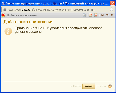 Рис. 1-14. Создание новой пустой информационной базы для приложения «Бухгалтерия предприятия» для пользователя-студента «Иванов».