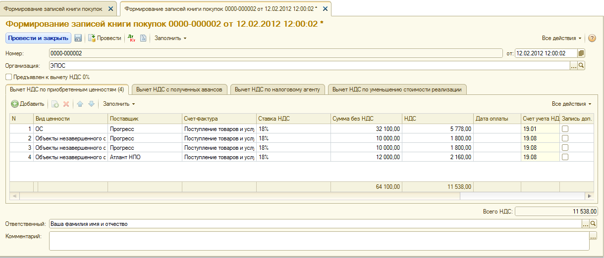 Необходимо сформировать записи книги покупок по состоянию на 12.02.2012.
