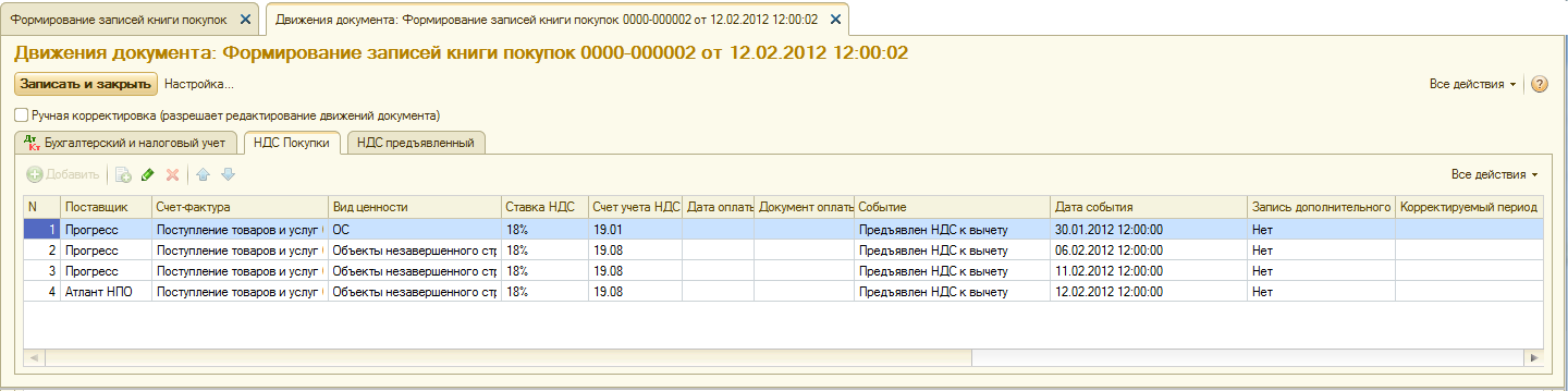 Рис. 9-48. Движения документа в регистре НДС покупки