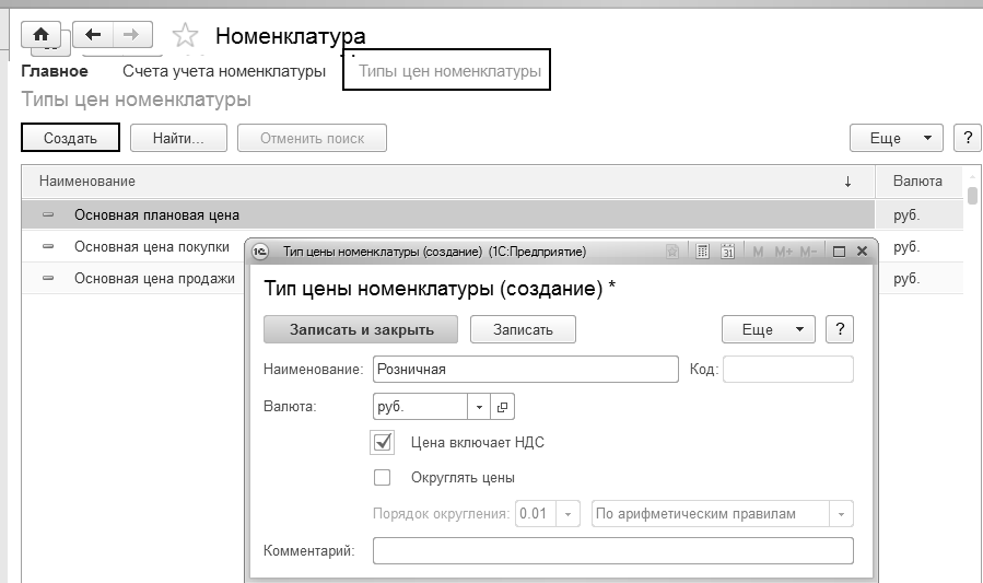 В верхней части формы кликните по ссылке "Типы цен номенклатуры". Создайте тип цены "Розничная". Валюта цены по умолчанию – "руб.", "Цены включают НДС" – флаг установлен. Элемент следует записать и закрыть.