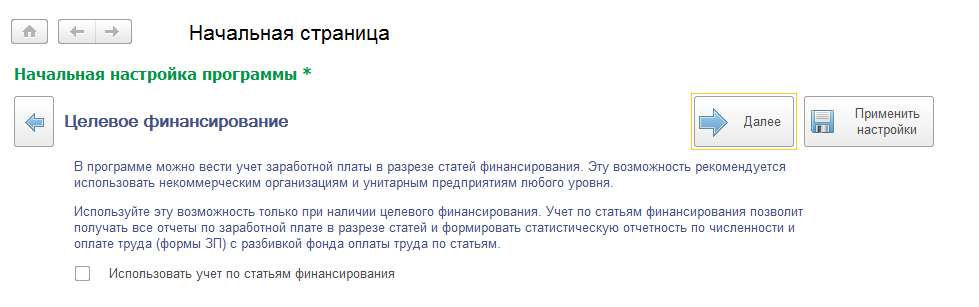 В учебной базе не планируется проводить учет источников финансирования, продолжим выполнять действия, нажав команду "Далее".
