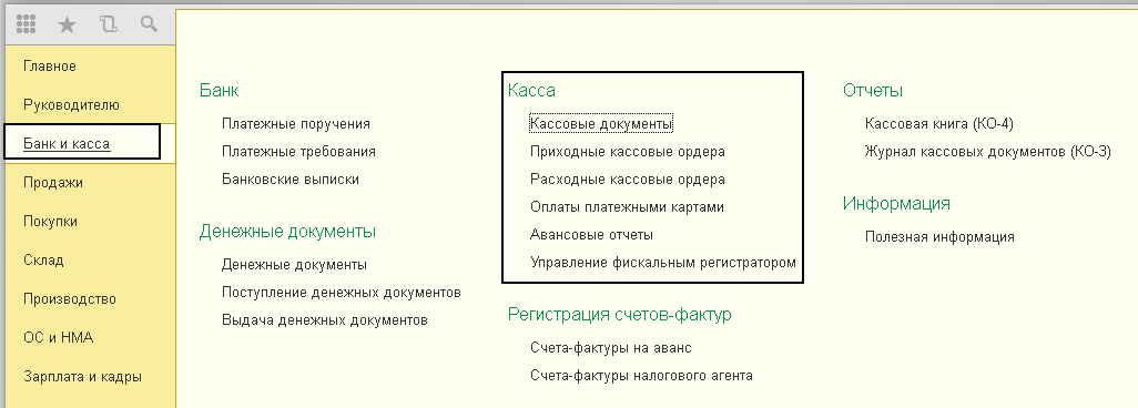 Для обращения к документам по учету денежных средств необходимо открыть соответствующий журнал документов. Для этого необходимо обратиться на панели разделов «Банк и Касса».