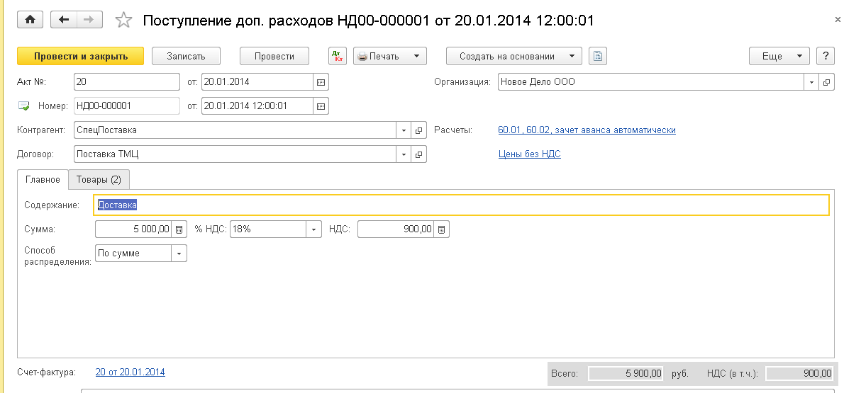 20 января зарегистрируйте доставку ТМЦ документом «Поступление доп. расходов» по договору «Поставка ТМЦ», которая поступила в бухгалтерию по первичному документу приходная накладная ТОРГ-12 и выделена в ней отдельной строкой. Доставка на сумму 5000 руб. НДС в цену не включен.