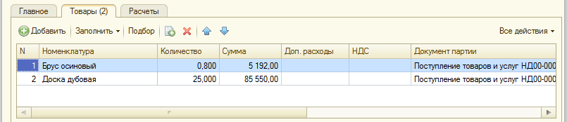 В табличной части документа, на закладке «Товары» указываются МПЗ, на которые необходимо отнести дополнительные расходы, а также их количество и стоимость. В качестве документа партии может быть указан документ «Поступление товаров и услуг» или «Авансовый отчет».