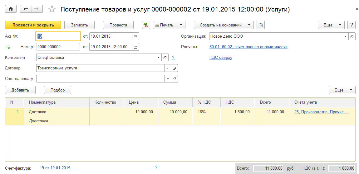 По акту выполненных работ №19 от 19 января отразить доставку в размере 10 000 руб. Цены указаны без НДС, НДС 18%. Зарегистрировать услугу по договору «Транспортные услуги» и прикрепить к ней счет-фактуру поставщика. Счет учета - 25, подразделение - Производство, статья затрат – Прочие затраты