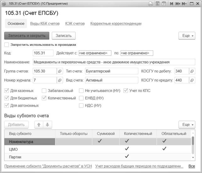 По счетам 105, ведется аналитический учет по номенклатуре материальных запасов (субконто1 "Номенклатура" типа справочник), по материально ответственным лицам и подразделениям (субконто2 "Центры материальной ответственности"), а также по партиям (необязательный).