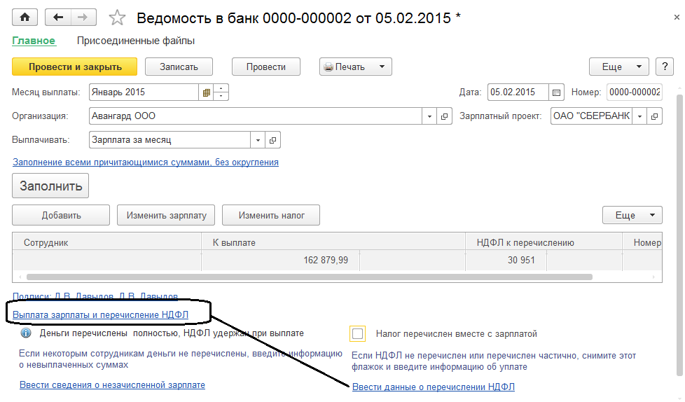 Для способа выплаты "Зарплата за месяц" в ведомости может быть указано, что НДФЛ за месяц перечислен полностью – в этом случае НДФЛ перечисленный зарегистрируется автоматически. Суммы НДФЛ к перечислению по сотрудникам отображаются непосредственно в ведомостях на выплату зарплаты.