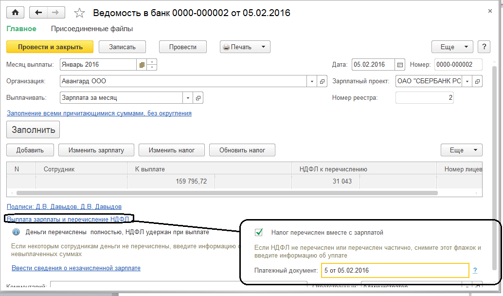 Для каждой ведомости на выплату зарплаты за месяц укажем реквизиты перечисления НДФЛ: для ООО "Авангард" п/п № 5 от 05.02.2016 (пример показан для ведомости в банк, для ведомости перечислений на счета указывается аналогично).