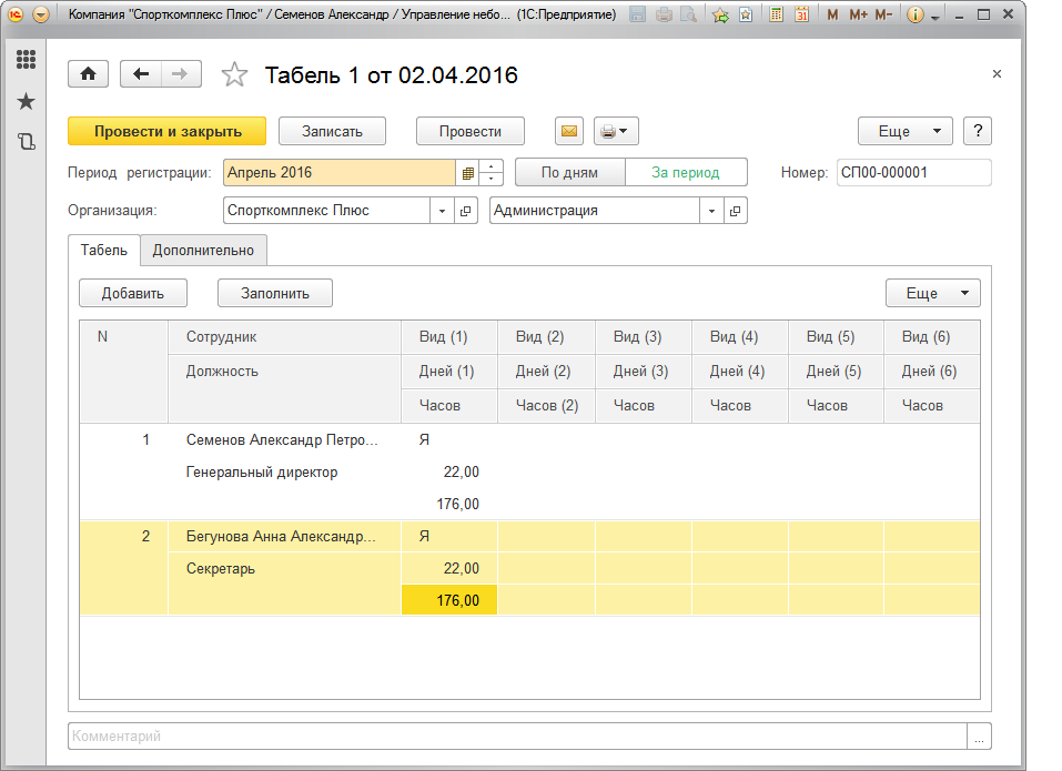 Данные в табеле могут регистрироваться сводно за период (при этом для одного сотрудника можно указывать до шести видов использованного времени), либо по дням.