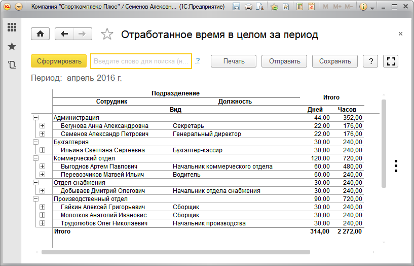 Рис. 246. Отчет "Отработанное время" с отбором по виду "Я" (явка) показывает фактически отработанное сотрудниками время