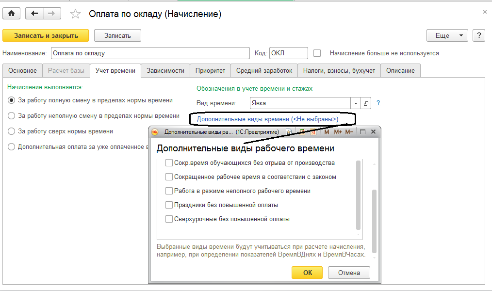 Также можно указать дополнительные виды рабочего времени – они будут учтены для начисления при расчете показателей "Время в днях" и "Время в часах".