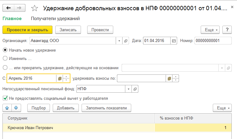 Введем удержание добровольных страховых взносов в НПФ в размере 1%. у сотрудника ООО "Авангард" Крючкова И.П. с 01.04.16. Для этого из раздела "Зарплата / Алименты и другие удержания" создадим документ "Удержание добровольных взносов в НПФ" и заполним его как на рисунке ниже.