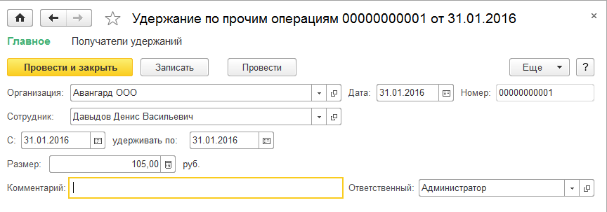 Из заработка сотрудника ООО "Авангард" Давыдова Д.В., как ответственного лица, удержали сумму недостачи в кассе за январь 2016г. в размере 105 руб. Введем удержание в счет расчетов по прочим операциям. Для этого из раздела "Зарплата / Алименты и другие удержания" создадим документ "Удержание по прочим операциям" и заполним его как на рисунке ниже.