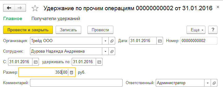 2. Из доходов Дуровой Н.А. за январь 2016г. вычитается сумма возмещения ущерба 350 руб.