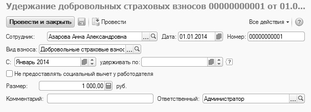 Введем удержание добровольных страховых взносов в размере 1000р. у Азаровой А.А. с 01.01.14 (вид удержания - Добровольные страховые взносы (суммой))