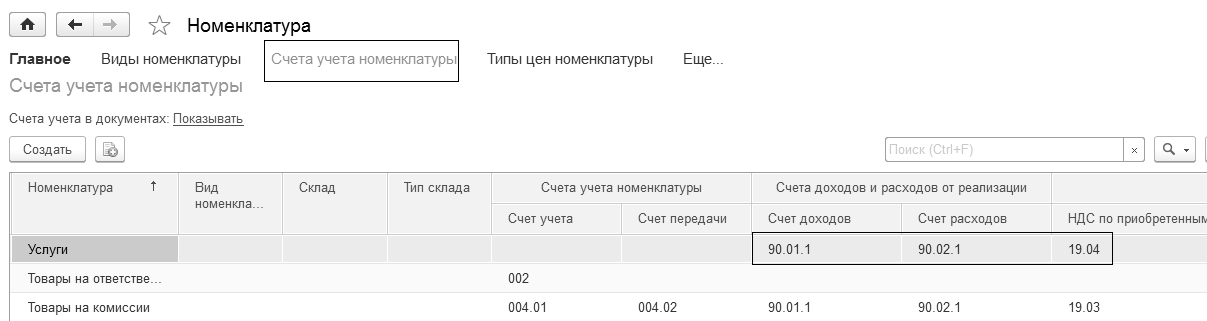 Рис. 13.3.2. Счета учета номенклатуры для номенклатурной группы "Услуги"