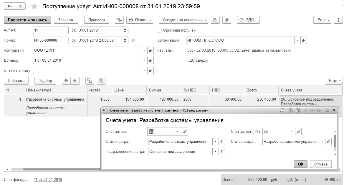 31.01.2019 года по акту № 11 ООО "ЦИН" осуществляет разработку системы управления организации "ИНКОМ ПЛЮС". Цена услуги за январь 2019 года составила 197 000 рублей (НДС 20% сверху). Договор № 1 от 09.01.2019 года. Организацией "ЦИН" представлен счет–фактура № 11 от 31.01.2019 года на сумму 236 400 руб. Затраты списываются на счет 26 на основное подразделение по статье затрат – "Разработка системы управления".