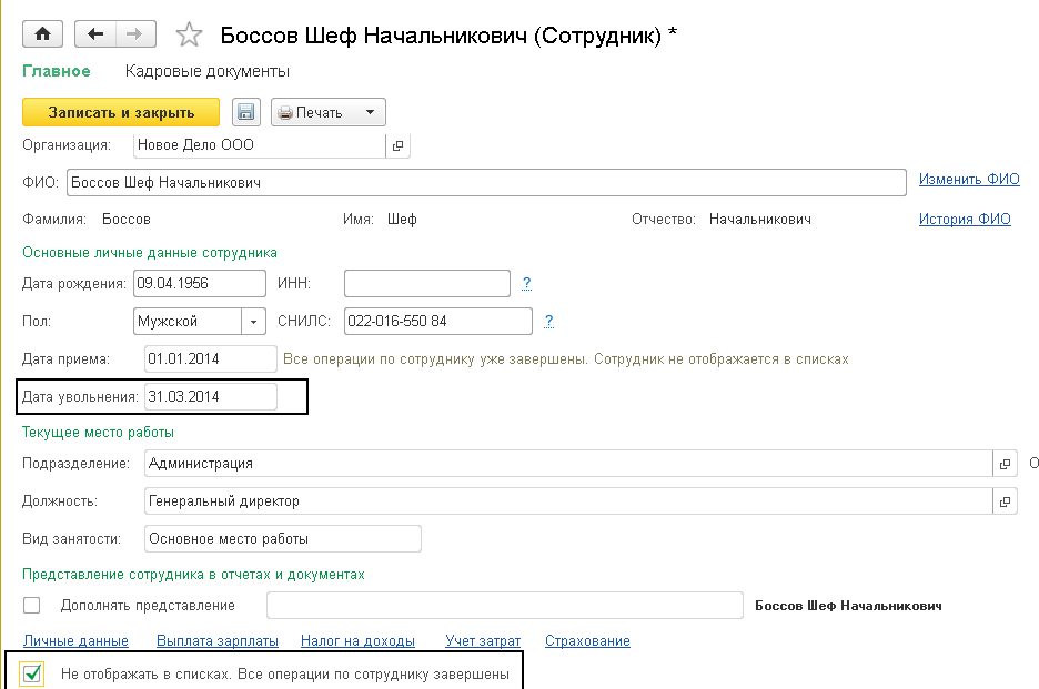 Увольнение сотрудника отражается в программе при упрощенном учете посредством  указания даты увольнения в справочнике «Сотрудники». В дополнение к этому можно еще уставить признак «Не отображать в списках» и исключить его из списка активных актуальных сотрудников и действующих договоров.
