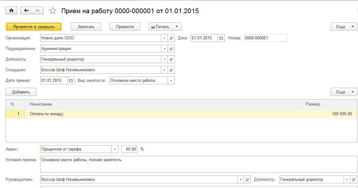 01 января Боссова Ш.Н. в подразделение Администрация на должность генерального директора с окладом 100 000 руб.. Указать для него лицевой счет в Сбербанке №1111111111111111. Зарегистрировать заявления на вычет на ребенка (114) и имущественный вычет – сумма 500 000 руб.