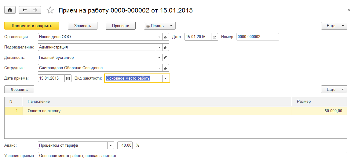 2.      15 января Счетоводову О.С. в подразделение Администрация на должность главного бухгалтера с окладом 50 000 руб.,