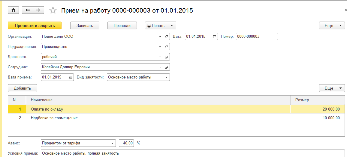 3.      01 января Копейкина Д.Е. в подразделение Производство, должность Рабочий с окладом 20 000 руб. и надбавкой за совмещение 10 000 руб.