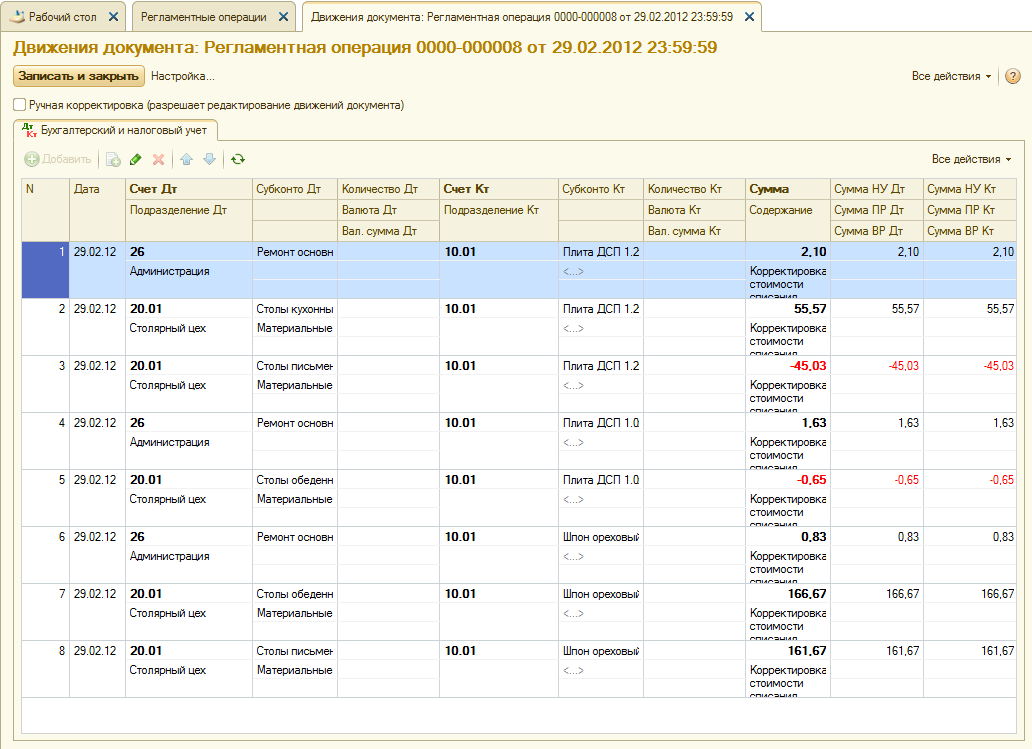 Открыв форму с результатами проведения документа, можем убедиться, что при проведении регламентной операции по корректировке стоимости номенклатуры за февраль сформированы бухгалтерские записи, приведенные на рис.15-5.