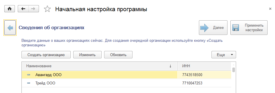 Обеспечивается настройка ввода сведений о юридическом лице. Далее можно будет сразу ввести основные сведений одной организации. Если выбран вариант учета по нескольким организациям, то в последующем (на шаге "Сведения об организации") предлагается добавить список организаций (и/или обособленных подразделений, выделенных на отдельный баланс).