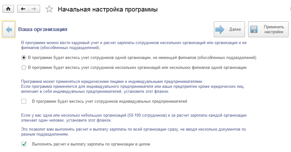 Настройка обеспечивает возможность ввода документов начисления и выплаты заработной платы за месяц либо отдельно по каждому подразделению, либо в целом по организации.