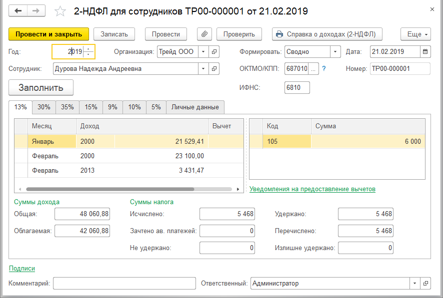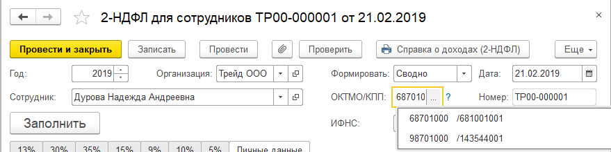 Выдадим справку 2-НДФЛ для увольняющейся сотрудницы. Для этого откроем список документов в разделе "Налоги и взносы/ 2-НДФЛ для сотрудников" и по команде "Создать" создадим новый документ в ООО "Трейд": дата 21.02.2019, год 2019, справка формируется сводно (т.к. доходы сотрудницы зарегистрированы только по одному коду ОКТМО и не имеет значения, какую настройку здесь выбрать) для Дуровой Н.А.