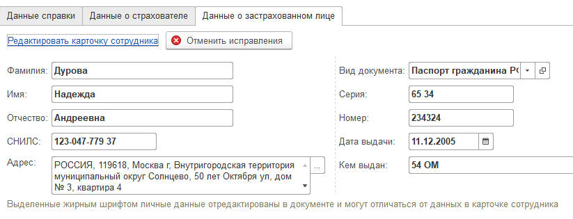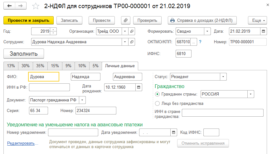 Документ заполняется автоматически при выборе сотрудника. В документе добавлена возможность просмотра сведений о доходах и суммах налога по конкретной справке, а также просмотра и корректировки личных данных физлица.