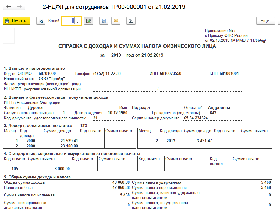 Проведем документ. Выведем на печать справку о доходах по форме 2-НДФЛ.