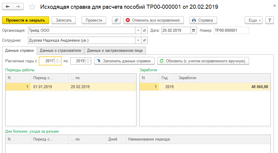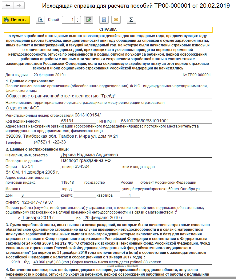 Выдадим справку о заработке для расчета пособий увольняющейся сотруднице. Для этого откроем список документов в разделе "Отчетность, справки/ Справки для расчета пособий (исх.)" и по команде "Создать" создадим новый документ в ООО "Трейд": дата 20.02.2019 для Дуровой Н.А. Документ будет заполнен автоматически.