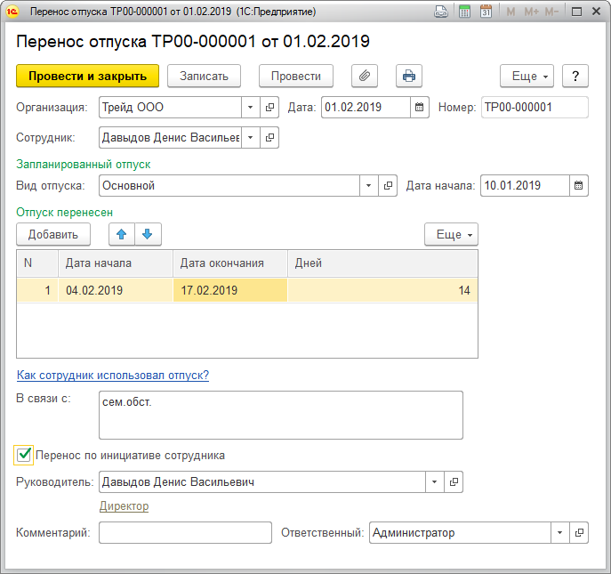 Перенос оформляется в том случае, если по каким-то причинам сотрудник не смог пойти в отпуск в запланированные в графике даты.